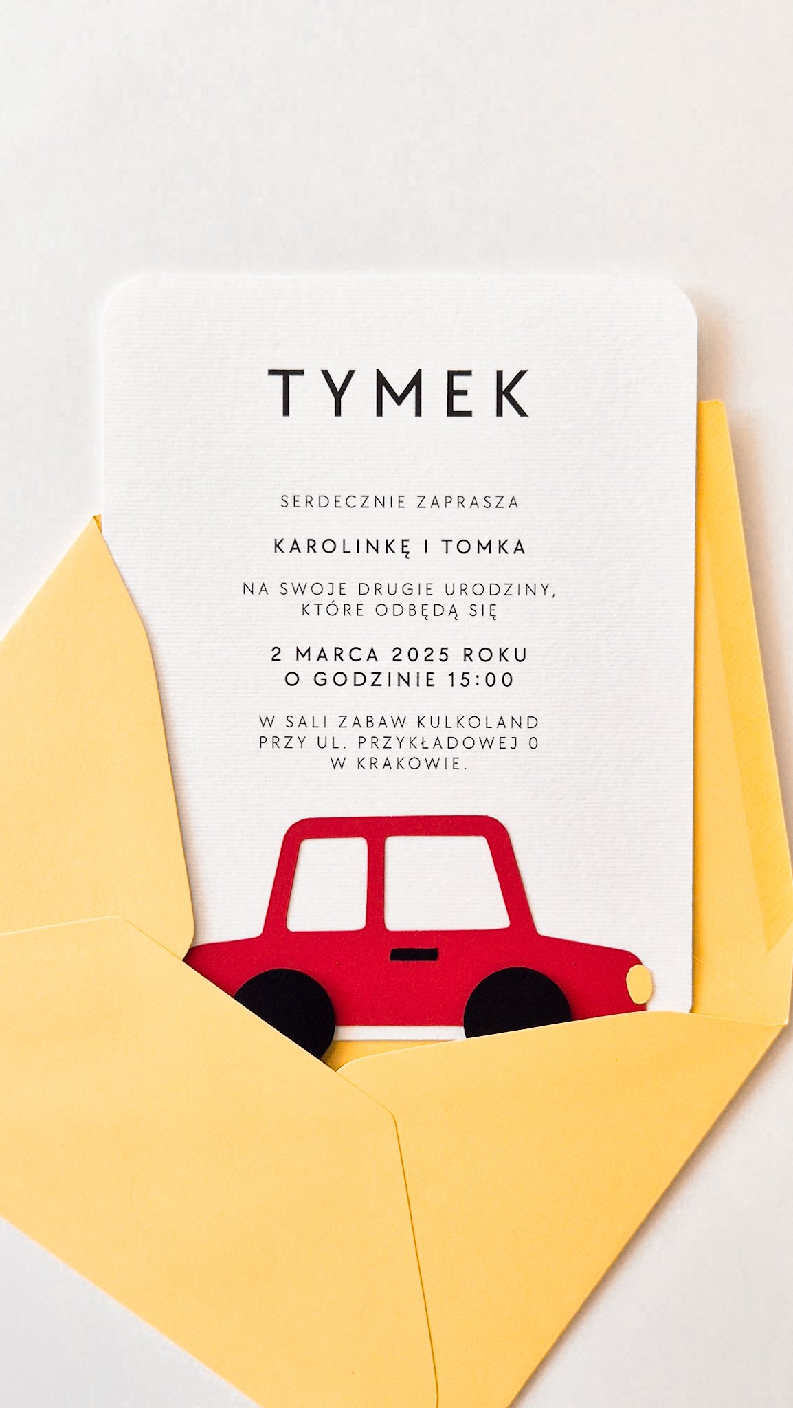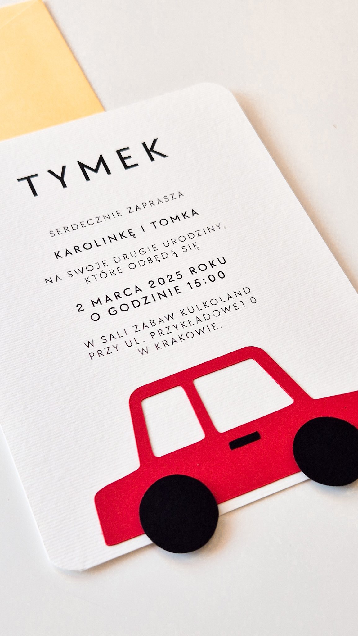 Przemyślany design z trójwymiarowymi elementami (kółka autka) sprawia, że zaproszenie wyróżnia się na tle innych i z pewnością zrobi wrażenie na gościach. Personalizowana treść nadaje mu indywidualny charakter, a przyjazna kolorystyka i eleganckie liternictwo sprawiają, że to nie tylko praktyczna forma zaproszenia, ale również piękna pamiątka z dziecięcych urodzin. Doskonale sprawdzi się w zestawie z kopertą.